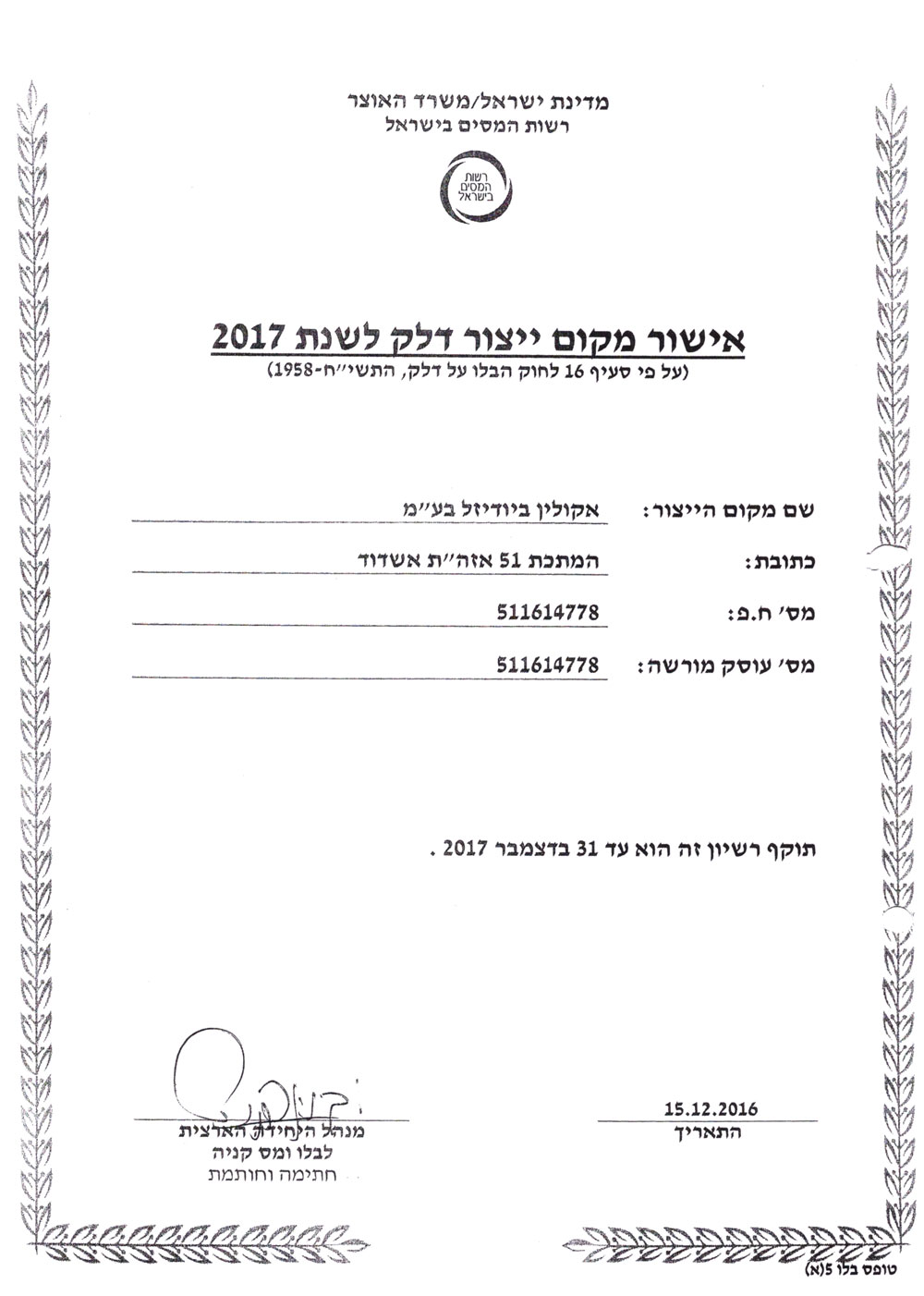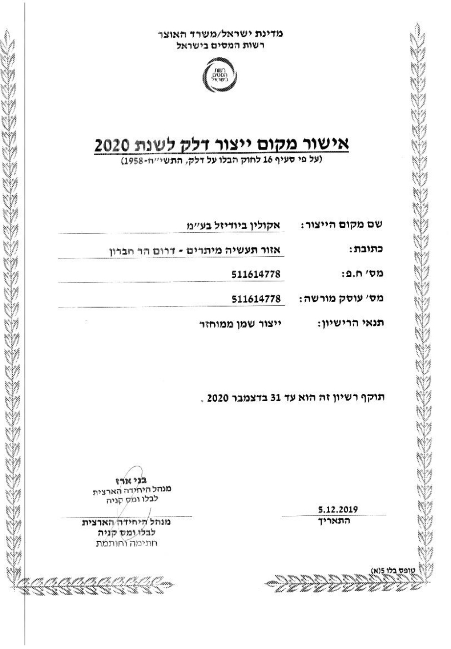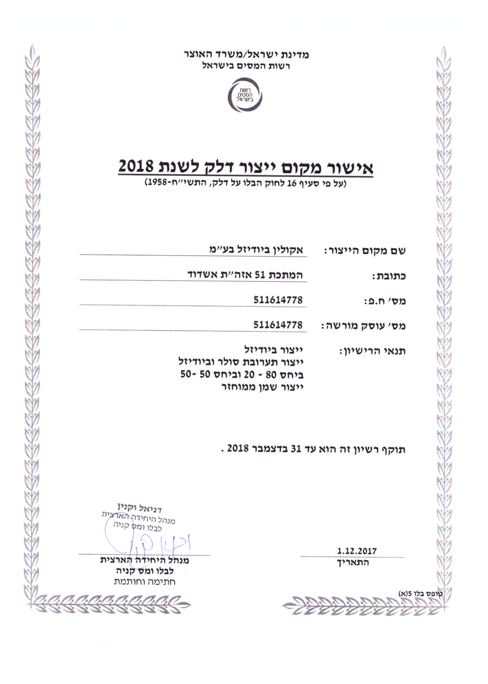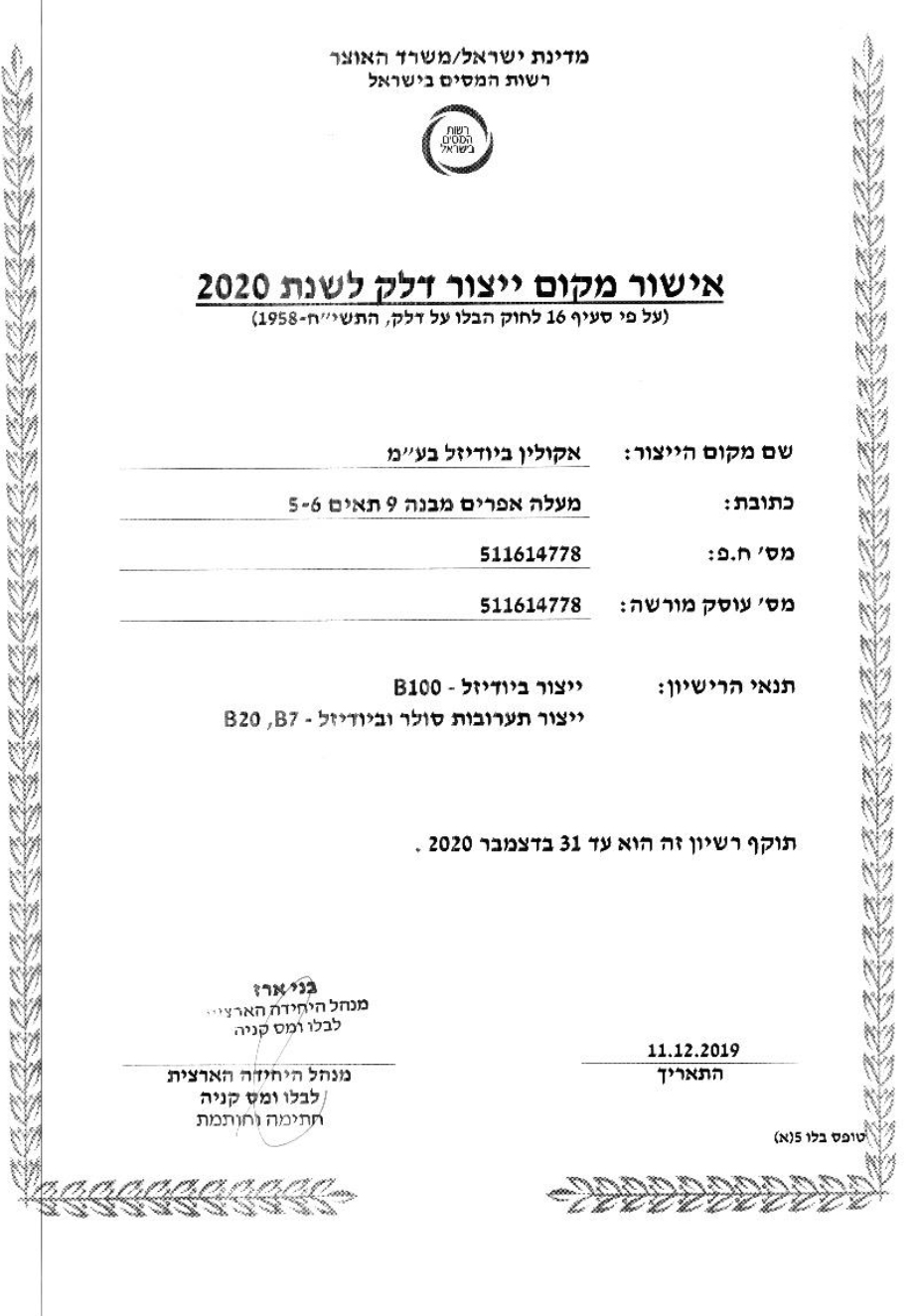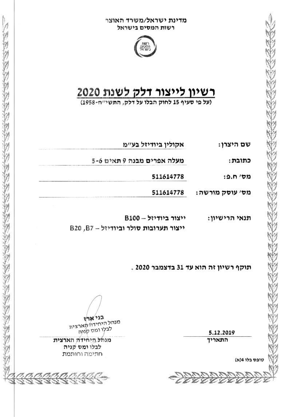 חברת אקולין ביו דיזל מורשית לייצר דלק מטעם משרד האוצר – רשות המסים, מנהל הדלק במשרד האנרגיה התשתיות, המשרד להגנת הסביבה ופעילותה מאושרת ע"י המבדקה הכימית ועומדת בתקן הישראלי 5731 ובתקן האירופי 14214. כמו כן, אקולין ביו דיזל מספקת בשותפות עם חברת שמרלינג סינכרו בע"מ, פתרונות מקצועיים, איכותיים וכלכליים בתחום הגנרציה הירוקה. אקולין ביודיזל מעמידה לרשות לקוחותיה צי גנרטורים חדישים וידידותיים לסביבה, המיועדים להשכרה לאתרי בניה, להפקות אירועים וכגיבוי לשעת חירום.