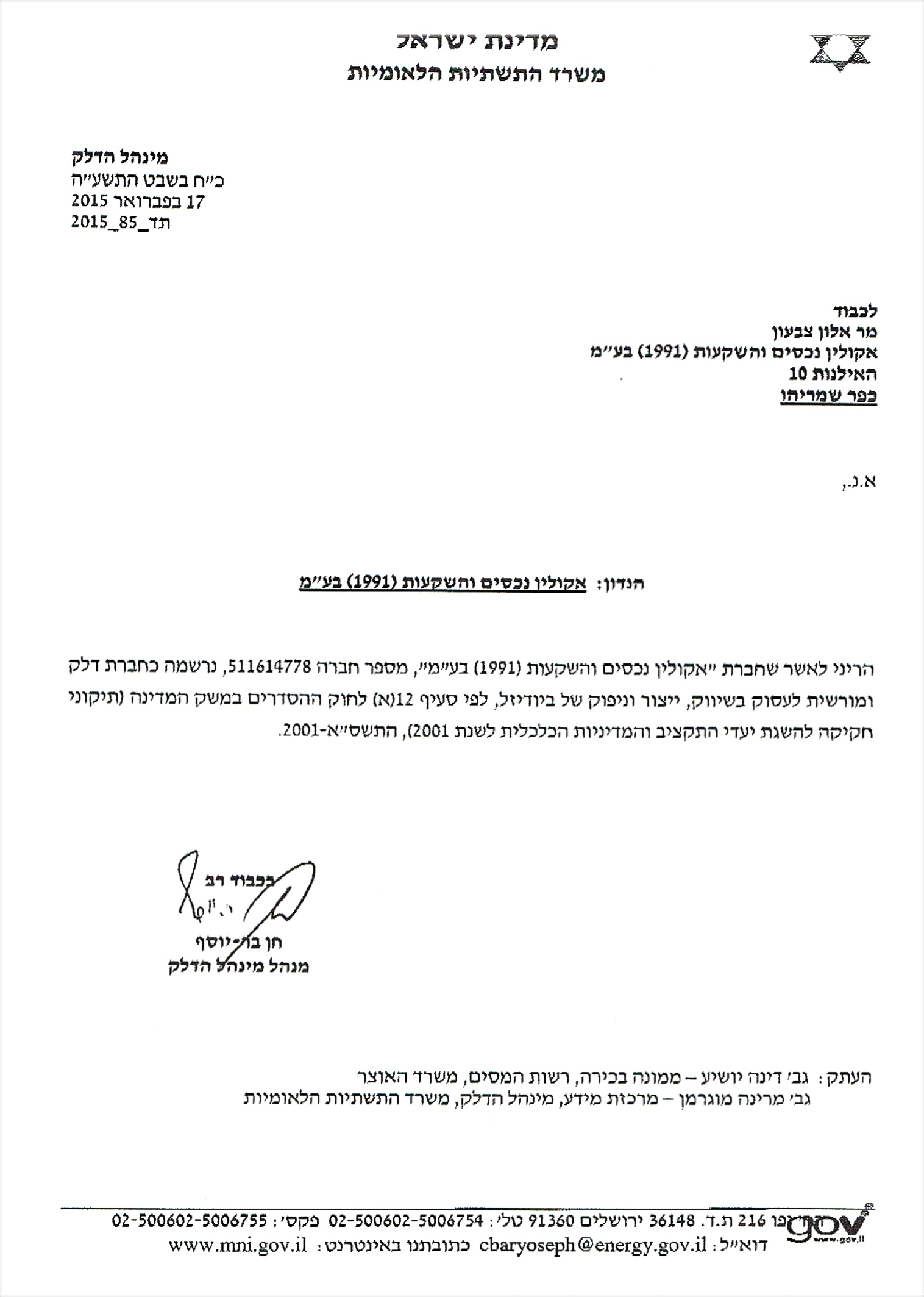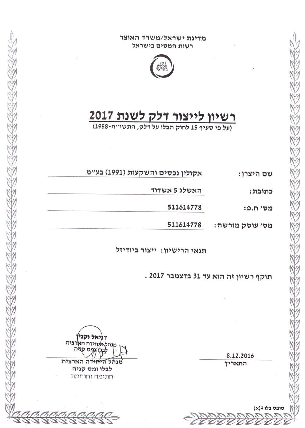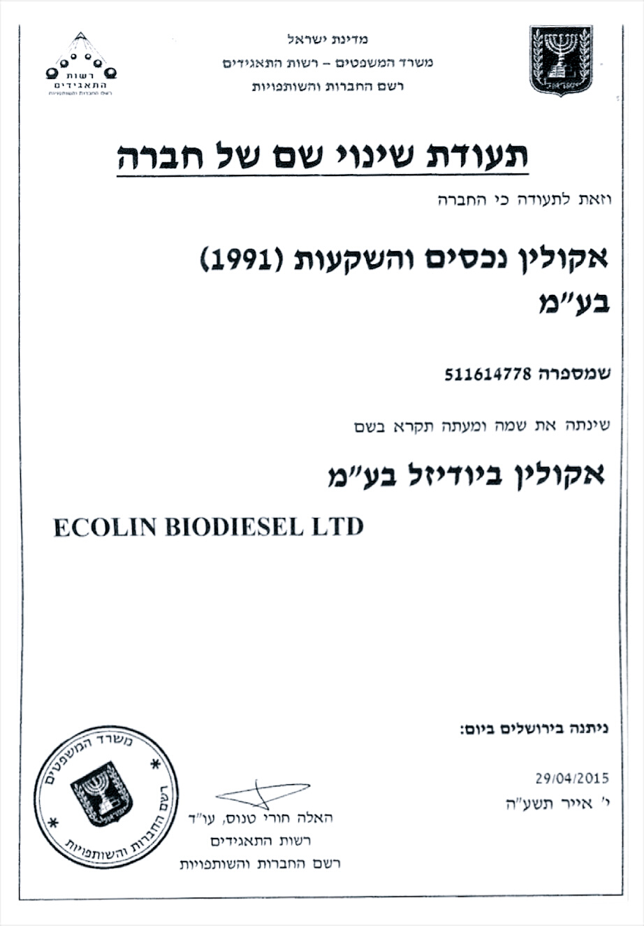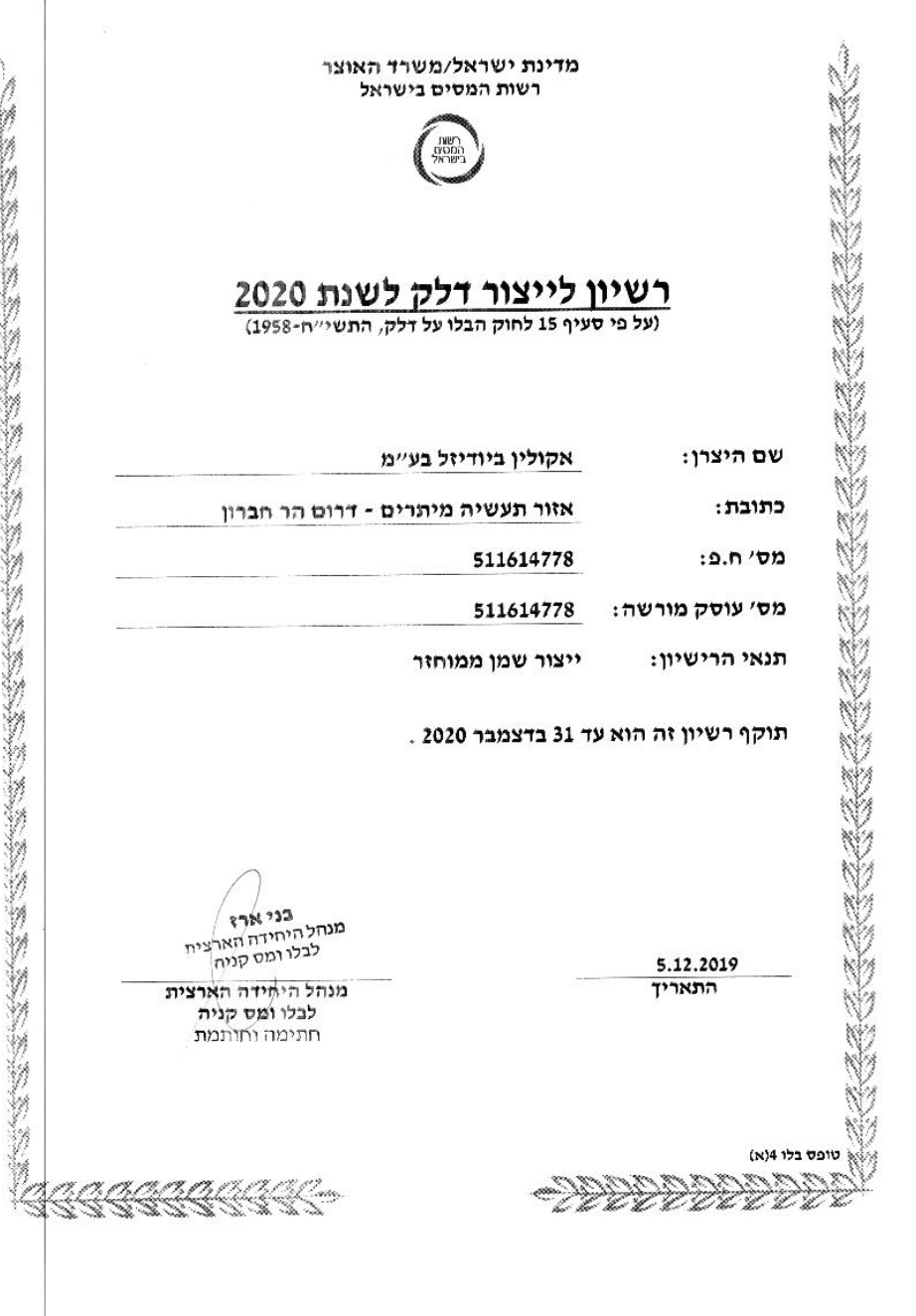 חברת אקולין ביו דיזל מורשית לייצר דלק מטעם משרד האוצר – רשות המסים, מנהל הדלק במשרד האנרגיה התשתיות, המשרד להגנת הסביבה ופעילותה מאושרת ע"י המבדקה הכימית ועומדת בתקן הישראלי 5731 ובתקן האירופי 14214. כמו כן, אקולין ביו דיזל מספקת בשותפות עם חברת שמרלינג סינכרו בע"מ, פתרונות מקצועיים, איכותיים וכלכליים בתחום הגנרציה הירוקה. אקולין ביודיזל מעמידה לרשות לקוחותיה צי גנרטורים חדישים וידידותיים לסביבה, המיועדים להשכרה לאתרי בניה, להפקות אירועים וכגיבוי לשעת חירום.
