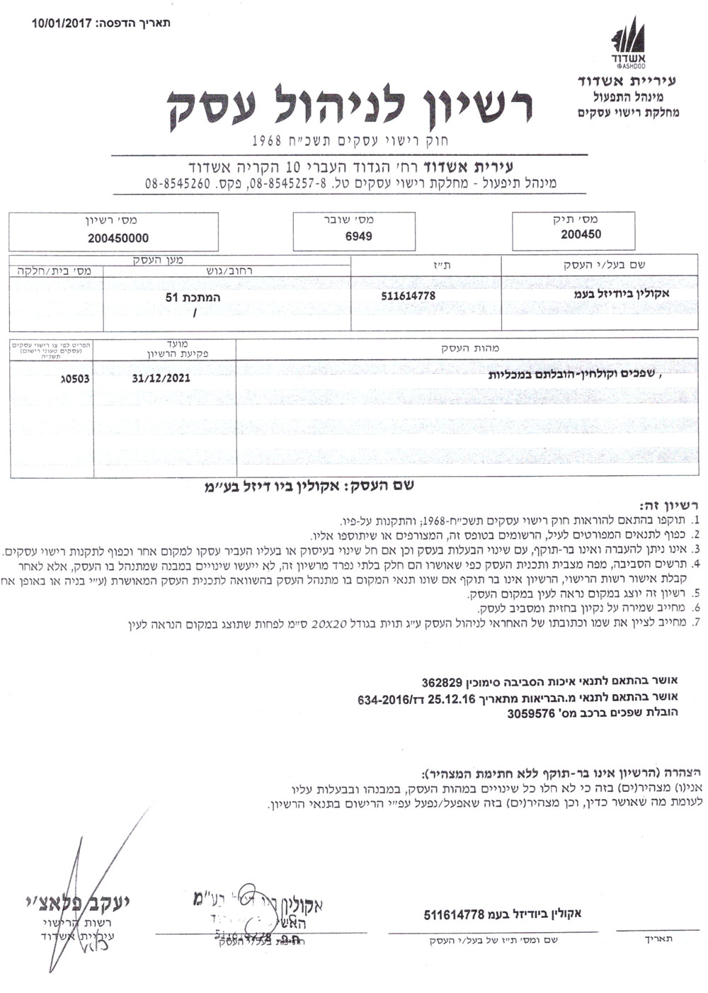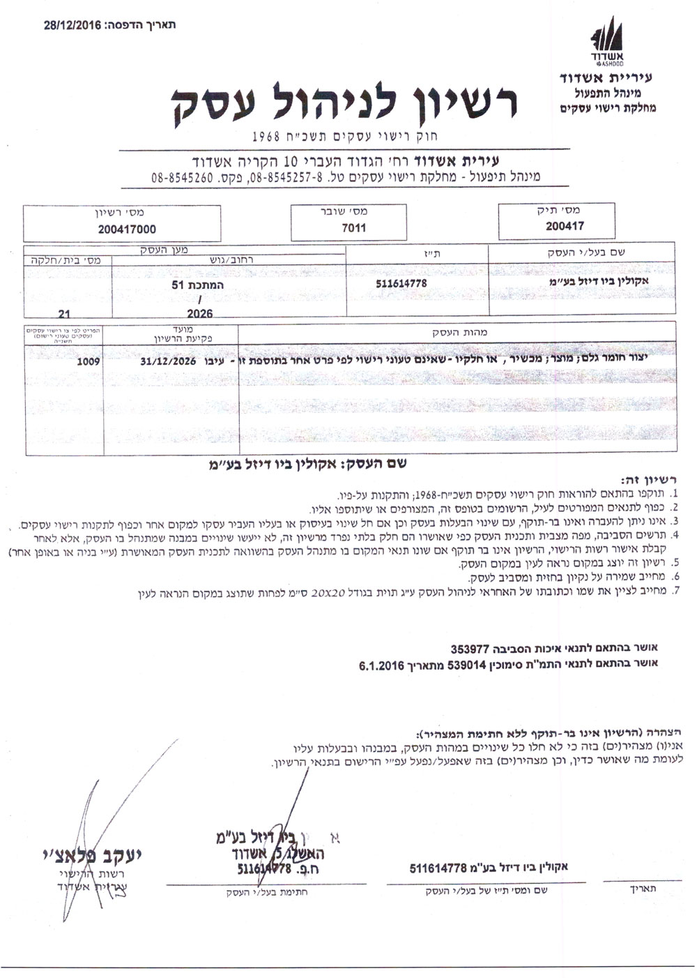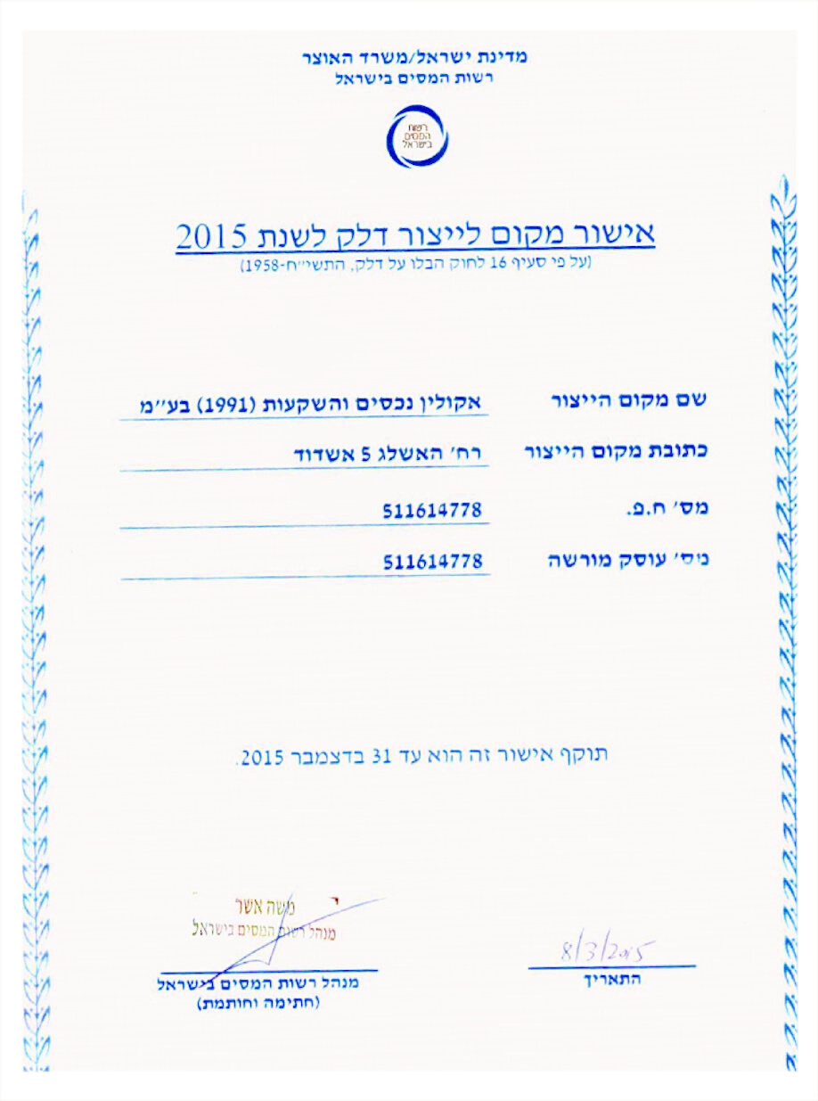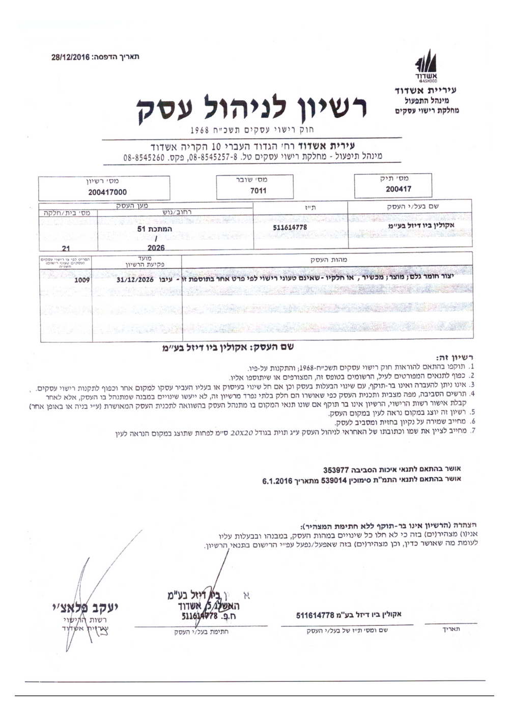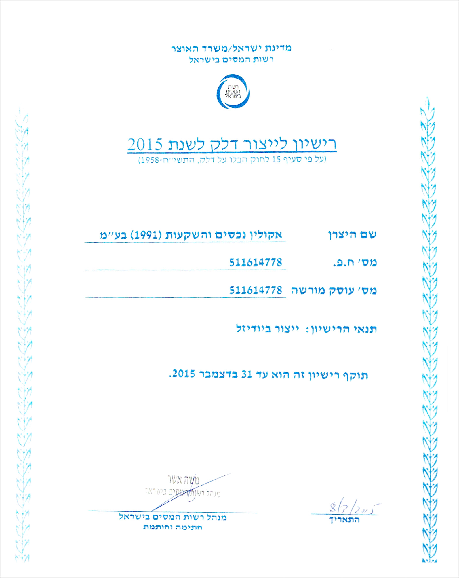 חברת אקולין ביו דיזל מורשית לייצר דלק מטעם משרד האוצר – רשות המסים, מנהל הדלק במשרד האנרגיה התשתיות, המשרד להגנת הסביבה ופעילותה מאושרת ע"י המבדקה הכימית ועומדת בתקן הישראלי 5731 ובתקן האירופי 14214. כמו כן, אקולין ביו דיזל מספקת בשותפות עם חברת שמרלינג סינכרו בע"מ, פתרונות מקצועיים, איכותיים וכלכליים בתחום הגנרציה הירוקה. אקולין ביודיזל מעמידה לרשות לקוחותיה צי גנרטורים חדישים וידידותיים לסביבה, המיועדים להשכרה לאתרי בניה, להפקות אירועים וכגיבוי לשעת חירום.